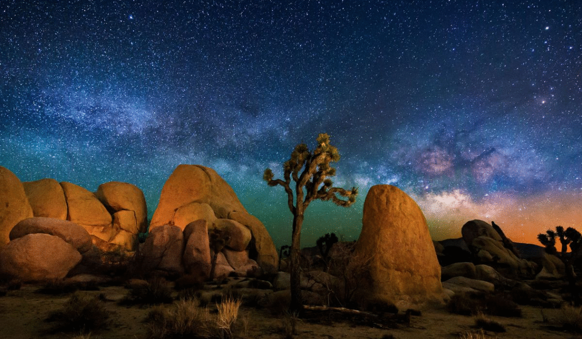 Twisted Joshua trees form haunting silhouettes under the Milky Way’s glowing arc — a dreamscape for photographers.